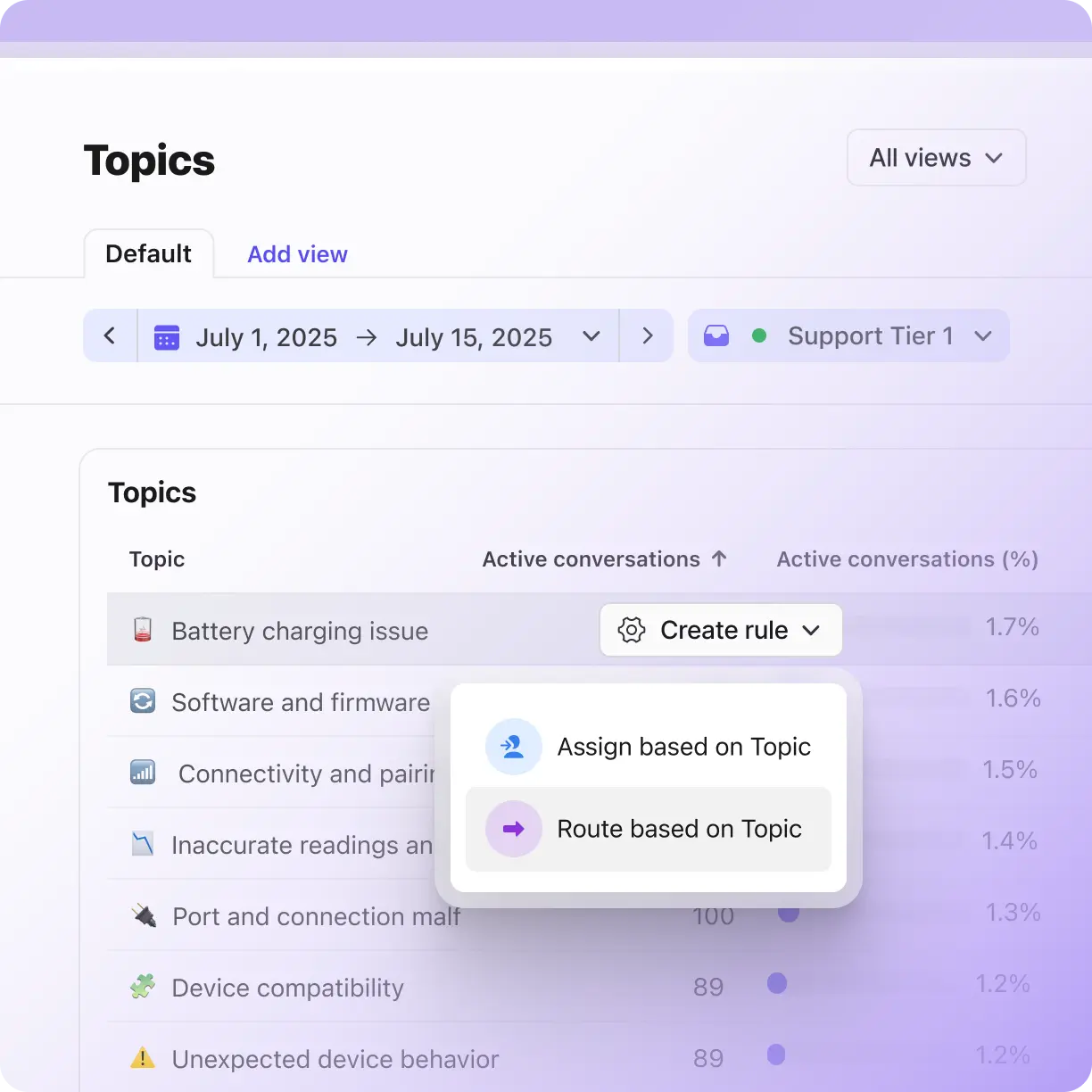 - Analytics dashboard that tracks trends in conversations, agent performance, and key support metrics