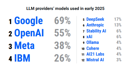 The same survey revealed that 69% of enterprises rely on Google’s in-house LLMs, i.e, Gemini and the Gemma models. Google’s models are lauded for their advanced reasoning capabilities and multimodal support.
