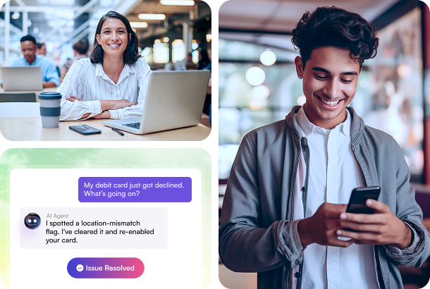 Built for BFSI, Retail, and Travel. Resolves up to 90% of routine queries out-of-the-box; gives agents contextual guidance to resolve the rest.