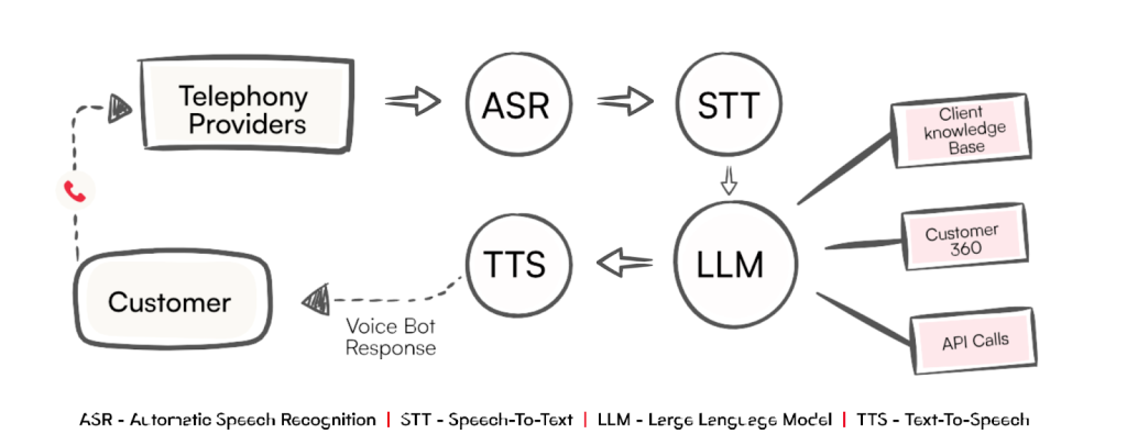 When a voice query is received, the Speech-to-Text (STT) engine transcribes it for the LLM, which has been trained on vertical-specific data for richer, more accurate responses. Customer intent is detected, relevant data is fetched from the Customer 360 module, and contextual information is provided to the LLM. The response is processed and converted back to speech via the Text-to-Speech (TTS) engine, enabling seamless, real-time interaction—all in milliseconds.