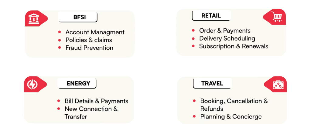 Tailored for Retail, BFSI, Travel, Energy, and more! For a deeper understanding of the voice bot’s capabilities, check out some demo recordings across vertical-specific use cases.